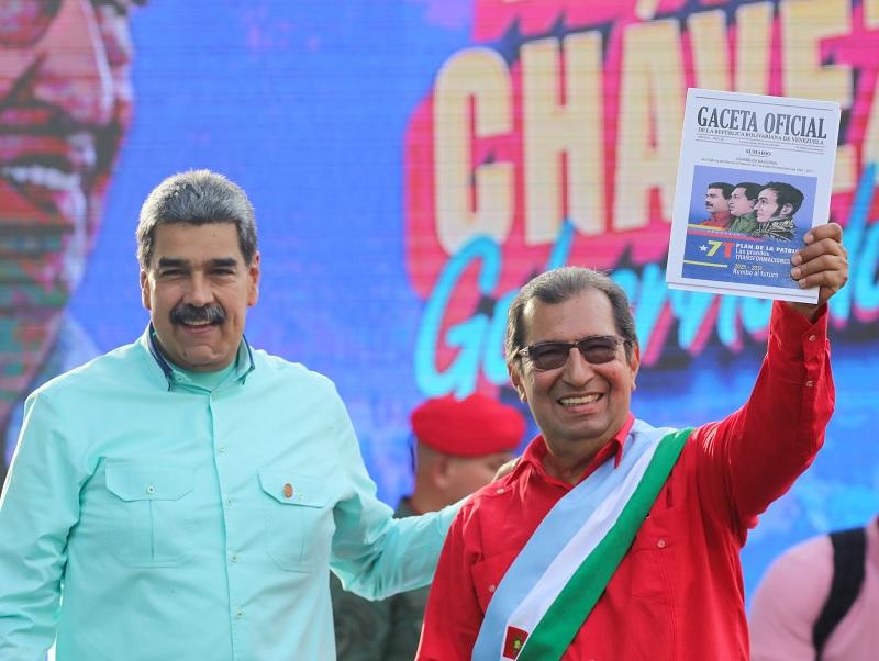 El presidente de la República Bolivariana de Venezuela, Nicolás Maduro, acompaña este lunes al recién electo gobernador de Barinas, Adán Chávez, durante su acto de juramentación como regente regional para el periodo 2025-2029, luego de triunfar en las elecciones del pasado 25 de mayo con 72,45 % de los votos.