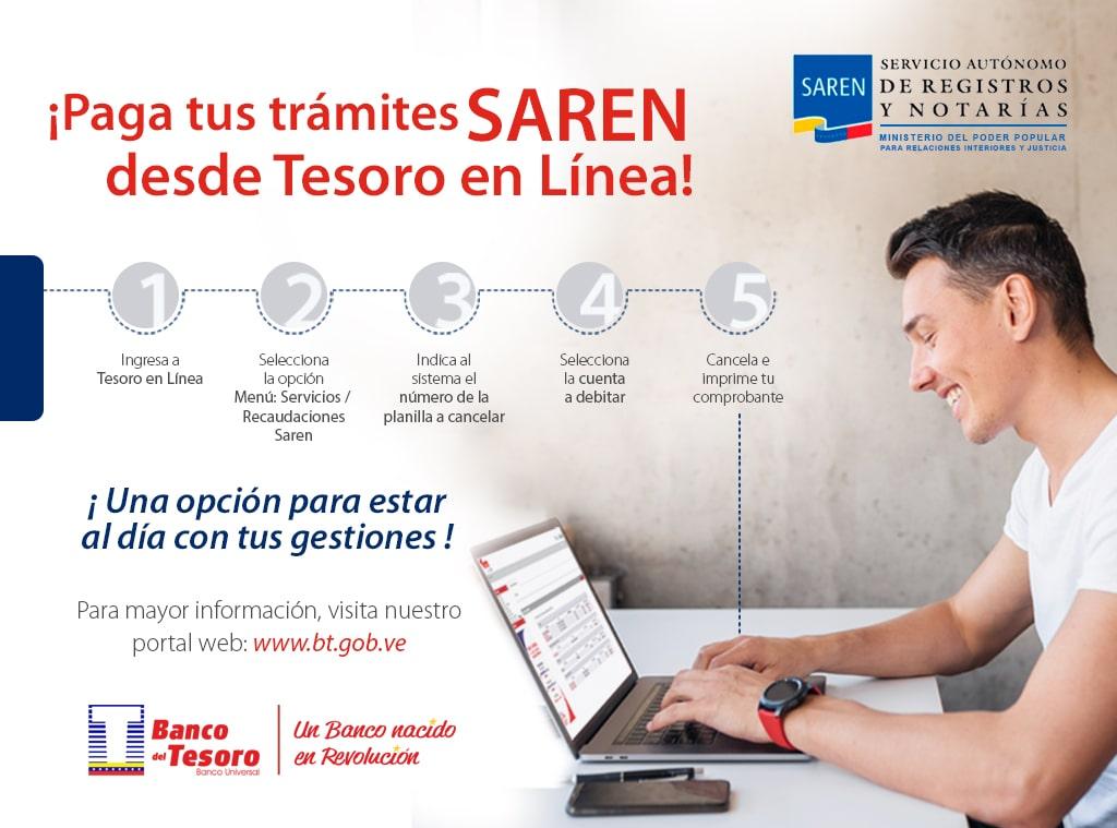 A partir de este lunes 14 de febrero de 2022, los clientes del Banco del Tesoro podrán pagar sus trámites del Servicio Autónomo de Registros y Notarías (SAREN), a través de la página web de la institución financiera, www.bt.gob.ve.