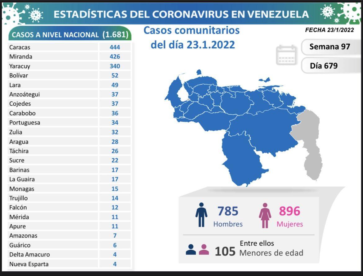 1,702 new infections were detected in the country, 1,681 cases of community transmission and 21 international ones in the last 24 hours. This was announced by the Executive Vice President, Delcy Rodríguez, on her account on Twitter.