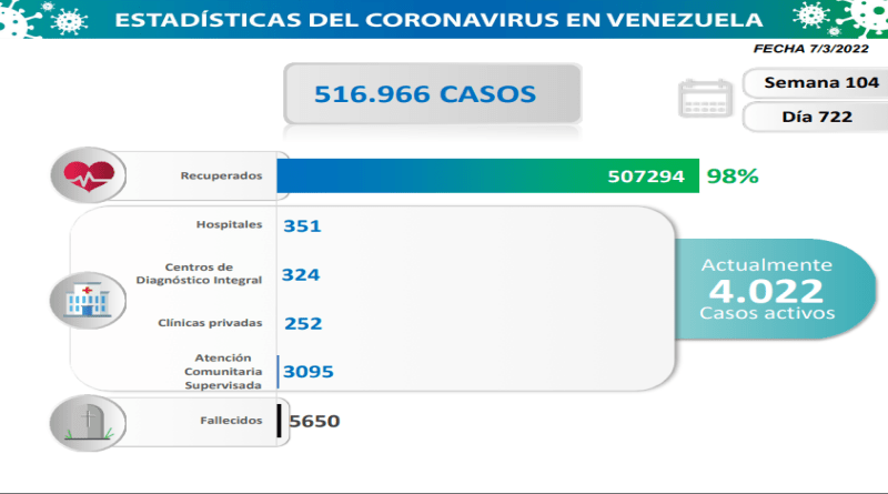 722 days after the first case of Covid-19 was confirmed in Venezuela, 516,966 is the total number of infections, with 507,294 recovered patients and 5,650 current active cases.