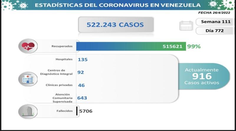 On day 772 since the pandemic arrived in Venezuela, no deaths were registered, for a total of 5,706 deceases to date. The number of recovered patients is 515,621 and there are 916 current active cases.