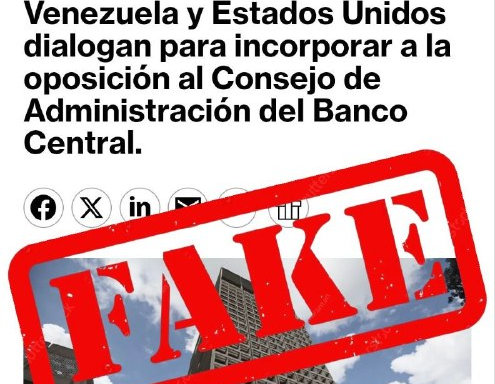 A través de la cuenta Miraflores Al Momento fue desmentida una información falsa publicada por el portal Bloomberg, en la que señalan que supuestamente Venezuela y el gobierno de Estados Unidos (EEUU) se encuentran en conversaciones para incorporar a la oposición al Consejo de Administración del Banco Central de Venezuela (BCV).