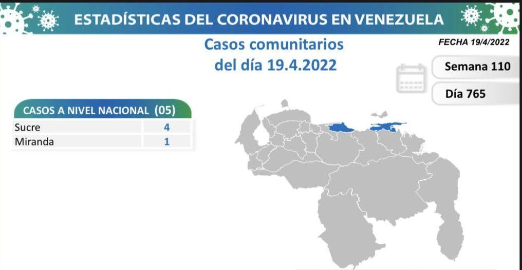 La entidad que hoy registró el mayor número de casos fue Sucre (4), con contagios activos en 1 municipio; seguido por el estado Miranda (1).