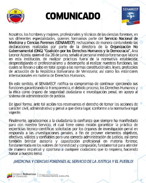 El personal técnico profesional de las ciencias forenses, adscrito al Servicio Nacional de Medicina y Ciencias Forenses (Senamecf), a través de un comunicado, rechazó las acusaciones infundadas por parte de la directora de la ONG Coalición por los Derechos Humanos y la Democracia, Ana Leonor Acosta, quien acusó al personal médico forense de realizar prácticas fuera de las normativas establecidas por la legislación venezolana.