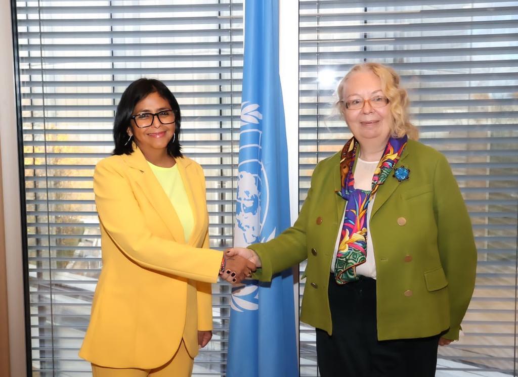 #EnFotos || La Vicepdta. Ejecutiva, @delcyrodriguezv, sostuvo reunión de trabajo con la Directora General de la ONU, @UN_Valovaya, en las oficinas de la sede en Ginebra, donde abordaron aspectos del multilateralismo y sus desafíos actuales, en el marco del nuevo orden mundial. pic.twitter.com/eHKPg2deLi