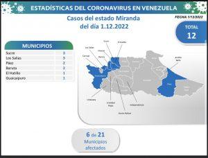 Miranda presenta el mayor número de contagios en 6 de sus 21 municipios afectados: Sucre (3), Los Salias (3), Páez (2), Baruta (2), entre otros que se detallan en la imagen adjuntada a continuación:
