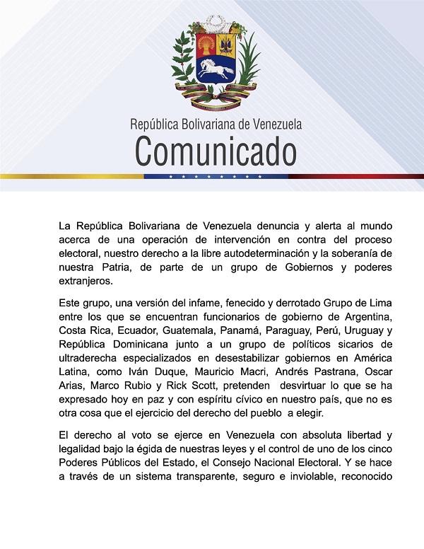 A través de un comunicado publicado en su red social X, @yvangil, el ministro del Poder Popular para las Relaciones Exteriores, Yván Gil, reseñó que la República Bolivariana de Venezuela, denuncia ante el mundo sobre la intervención de la derecha extranjera en contra del proceso electoral presidencial realizado este domingo 28 de julio.