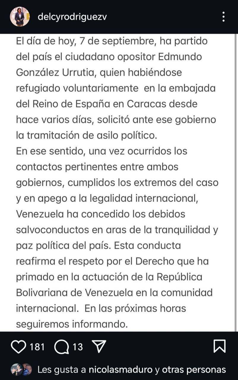The announcement was made by the executive vice president, Delcy Rodríguez, through a message on Instagram, in which she detailed that González Urrutia had been processing this request for asylum for several days: