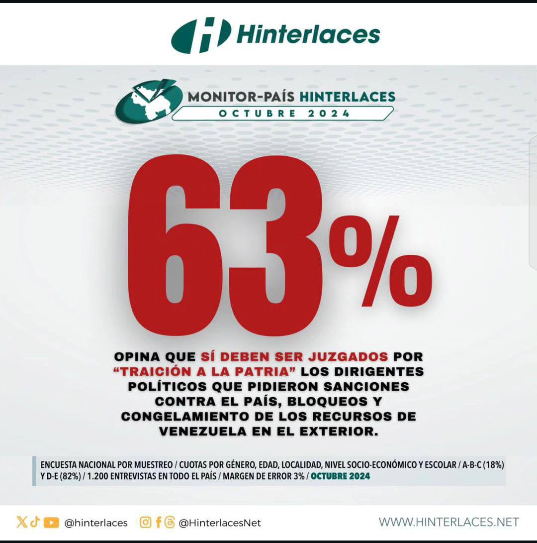 A la pregunta: ¿Deben ser juzgados por traición a la Patria, los dirigentes políticos que pidieron sanciones contra el país, bloqueos y congelamiento de los recursos de Venezuela en el exterior?, el 63% respondió afirmativamente.