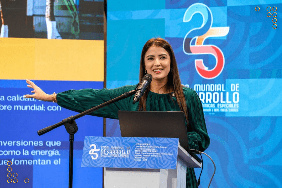 Durante la instalación del XXV Foro Mundial de Desarrollo de Zonas Económicas Especiales (ZEE), que se celebra en la sala José Félix Rivas del Teatro Teresa Carreño, en Caracas, la presidenta del Instituto Marca País, Daniella Cabello, destacó el potencial y las bondades de la campaña “Hecho en Venezuela” en el desarrollo económico del país, así como su potencial exportador.