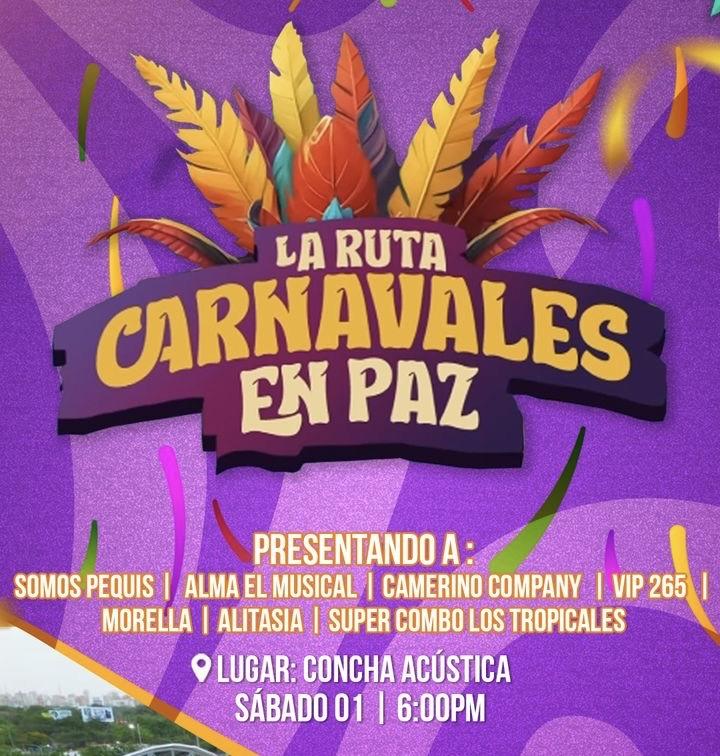 En la Concha Acústica se desarrollará La Ruta Carnavales en Paz, del 1 al 4 de marzo, a partir de las 4 pm, con música, diversión y más de 25 inflables gratis para los pequeños de la casa, a cargo de Camerino Company, Alma El musical y Somos Pequis. El show musical en vivo contará con presentaciones de: Felipe Peláez, Morella, VIP 265, Súper Combo Los Tropicales, Jhonny Medina, Alitasia, Valentina, Gaiteros de Corazón, Roberto González, Madero Show, Danny Rojas, Los Blanco, Argenis Carruyo y Cardenales del éxito.