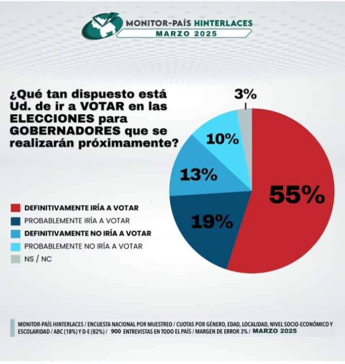 La encuestadora Hinterlaces reveló que, según un sondeo de opinión realizado en todo el territorio nacional durante el mes de marzo, el 74 % de los encuestados está dispuesto a votar el próximo 25 de mayo.
