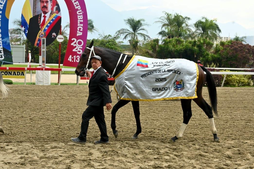 El caballo Li Tre Frarelli, con la monta del jinete profesional Jhonatan Aray y el entrenamiento de Luis Peraza, triunfó en el CIV Clásico Internacional Presidente de la República, que se realizó este domingo 20 de abril de 2025, en el Hipódromo La Rinconada.