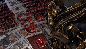 El féretro del difunto Papa fue colocado ante el Altar de la Confesión, y el coro entonó las Letanías de los Santos en latín por el descanso de su alma.