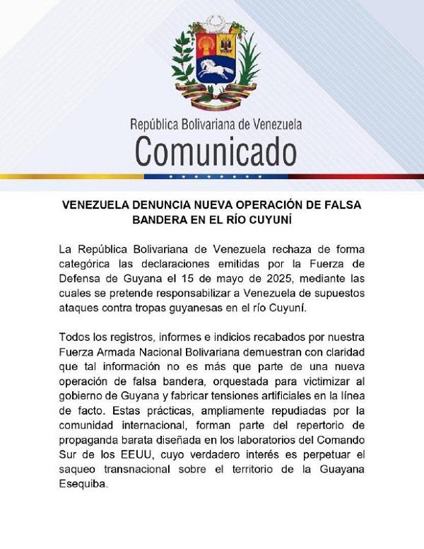 La República Bolivariana de Venezuela rechazó de manera categórica las declaraciones emitidas por la Fuerza de Defensa de Guyana el pasado 15 de mayo, en las que se intenta responsabilizar al país de supuestos ataques contra tropas guyanesas en el río Cuyuní.