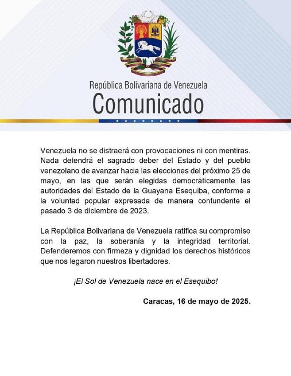 Venezuela enfatiza que no se distraerá con provocaciones y continuará con los avances de firmeza hacia las elecciones del 25 de mayo, en las que se elegirán las autoridades del Estado de la Guayana Esequiba, esto que cumple con el mandato popular expresado el pasado 3 de diciembre de 2023 en el referéndum consultivo.