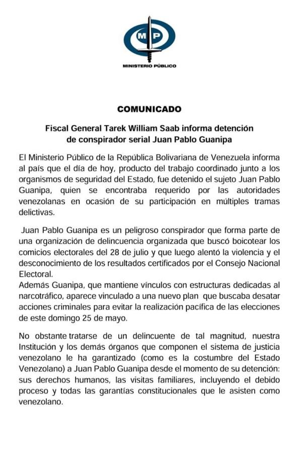 Por medio de un comunicado oficial publicado este viernes 23 de mayo, el Ministerio Público (MP) informó que, desde el momento de la detención de Juan Pablo Guanipa, se le ha garantizado todas las garantías constitucionales que le corresponden, incluido el acceso a visitas familiares.