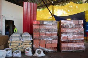 Esta jornada incluyó la entrega de 2.396 láminas de techo, 205 sacos de cemento gris, 4.650 bloques de arcilla, 30 metros cúbicos de arena lavada, 10 metros cúbicos de piedra picada, y 12 juegos de baños completos con una inversión que supera los 150.000 dólares.