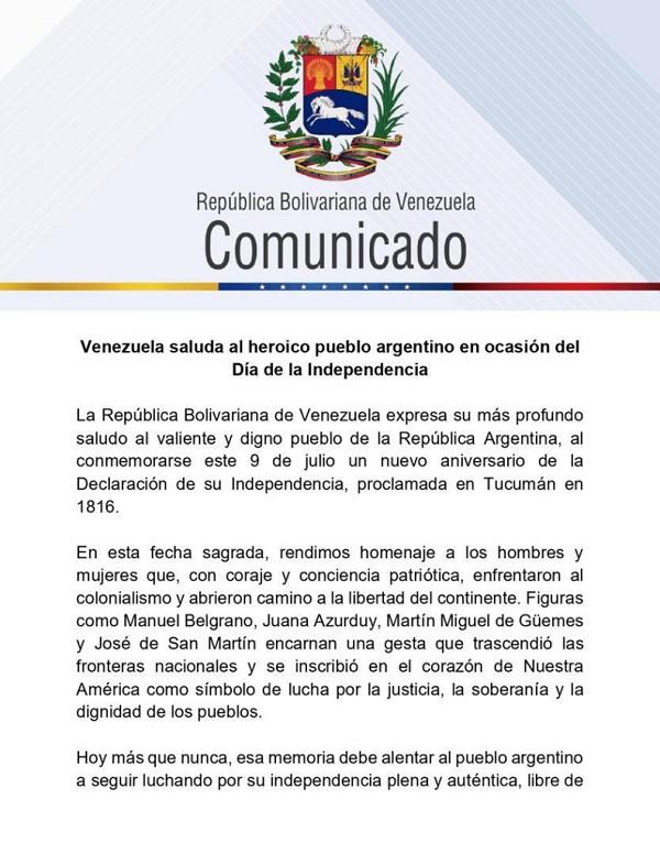 El Gobierno venezolano expresó su profundo respeto y admiración hacia el pueblo argentino, reconociendo su valentía y lucha histórica por la libertad. En el mensaje, se destaca la importancia de la Declaración de Independencia de 1816 como un acto heroico que no solo liberó a Argentina, sino que también inspiró a toda América Latina en su camino hacia la emancipación.