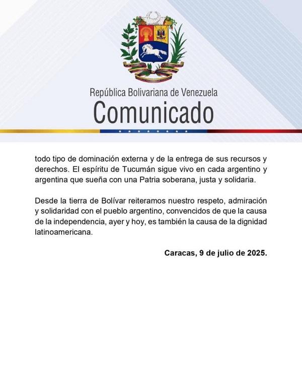 Venezuela resalta que, en la actualidad, el espíritu de Tucumán sigue vigente en cada argentino que defiende su soberanía. El texto enfatiza la necesidad de continuar la lucha por una independencia auténtica, libre de dominaciones externas y de la entrega de los recursos nacionales. «Hoy más que nunca, esa memoria debe alentar al pueblo argentino a seguir resistiendo», señala la misiva.