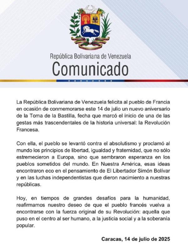 El Gobierno de la República Bolivariana de Venezuela, a través de un comunicado oficial difundido por el canciller Yván Gil en su canal de Telegram, extendió sus felicitaciones al pueblo de Francia con motivo del aniversario de la Toma de la Bastilla, celebrado este 14 de julio. La fecha marca un hito fundamental en la historia universal, al ser el punto de partida de la Revolución Francesa.