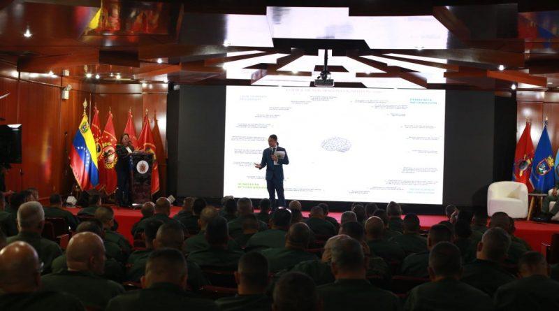 Durante la ponencia, que forma parte de la Jornada de Actualización para los Generales de Brigada y Contralmirantes de la Fuerza Armada Nacional, el vicepresidente sectorial resaltó el valor del manual «Calles, Redes, Medios, Paredes y Radio Bemba», una herramienta con contenido de resistencia política, cultural y militar, diseñado para contrarrestar las estrategias de dominación cognitiva.
