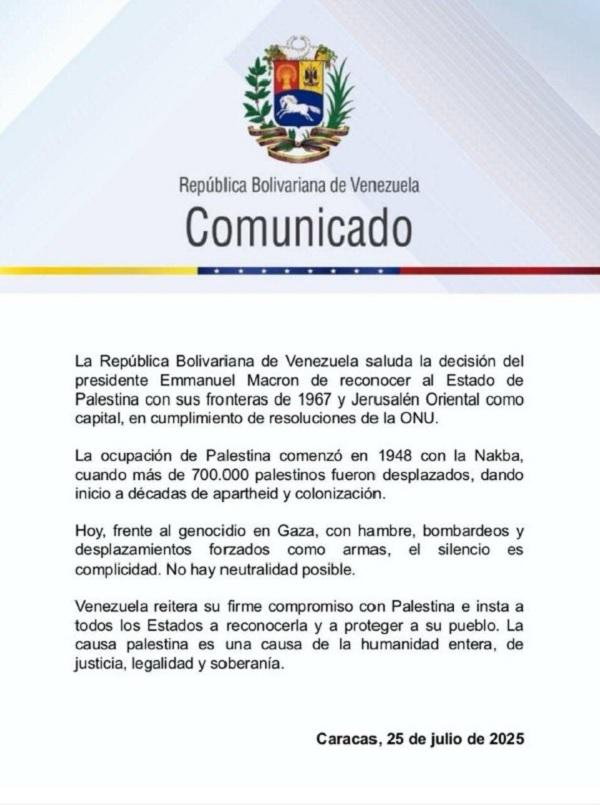La República Bolivariana de Venezuela, a través del canciller Yván Gil, saludó este viernes el reconocimiento oficial del Estado de Palestina por parte del presidente francés, Emmanuel Macron. Este histórico gesto incluye el respaldo a las fronteras de 1967 y a Jerusalén Oriental como capital palestina, marcando un avance significativo en la lucha por la autodeterminación del pueblo árabe.