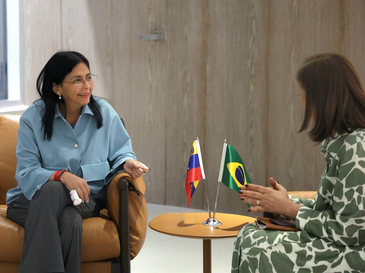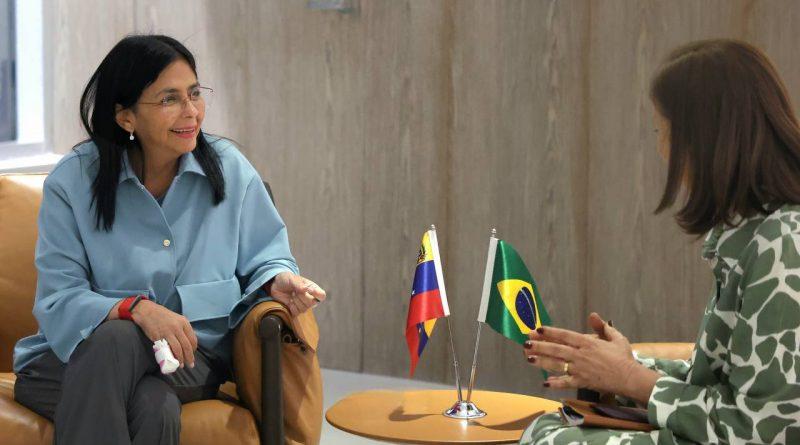 La vicepresidenta ejecutiva Delcy Rodríguez, se reunió este jueves con la embajadora de Brasil, Glivânia María de Oliveira, para evaluar los temas de la agenda bilateral entre ambos países, en el marco de la Diplomacia Bolivariana de Paz.