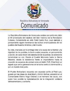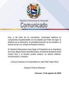 La República Bolivariana de Venezuela conmemora con júbilo el 99 aniversario del natalicio de Fidel Castro Ruz, líder histórico de la Revolución Cubana. Su pensamiento y ejemplo continúan inspirando las luchas emancipadoras de los pueblos de América Latina y el mundo, según destacó un Comunicado Oficial del Estado venezolano.