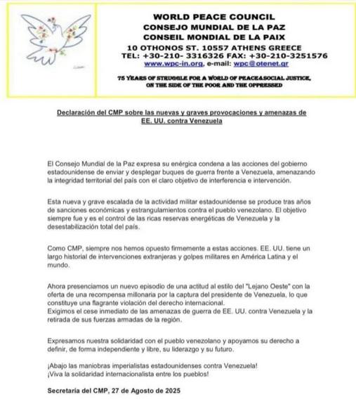 Ante esta situación, el Consejo Mundial de la Paz exigió el cese inmediato de todas las amenazas de guerra por parte de Estados Unidos y la retirada incondicional de sus fuerzas armadas de la región. Finalmente, expresó su solidaridad inquebrantable con el pueblo venezolano y apoyó su derecho a definir libre e independientemente su futuro y su liderazgo.