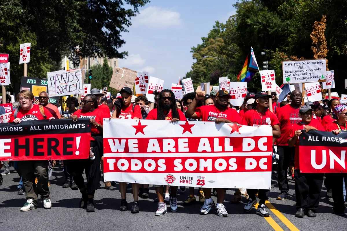 Miles de personas se movilizaron este sábado en la capital estadounidense, Washington, para rechazar las redadas contra migrantes realizadas por el Servicio de Control de Inmigración y Aduanas (ICE) y la militarización de la ciudad por parte de la Administración Trump. La protesta coincidió con la celebración del Labour Day y convocó a activistas de derechos humanos, jóvenes, trabajadores y migrantes.