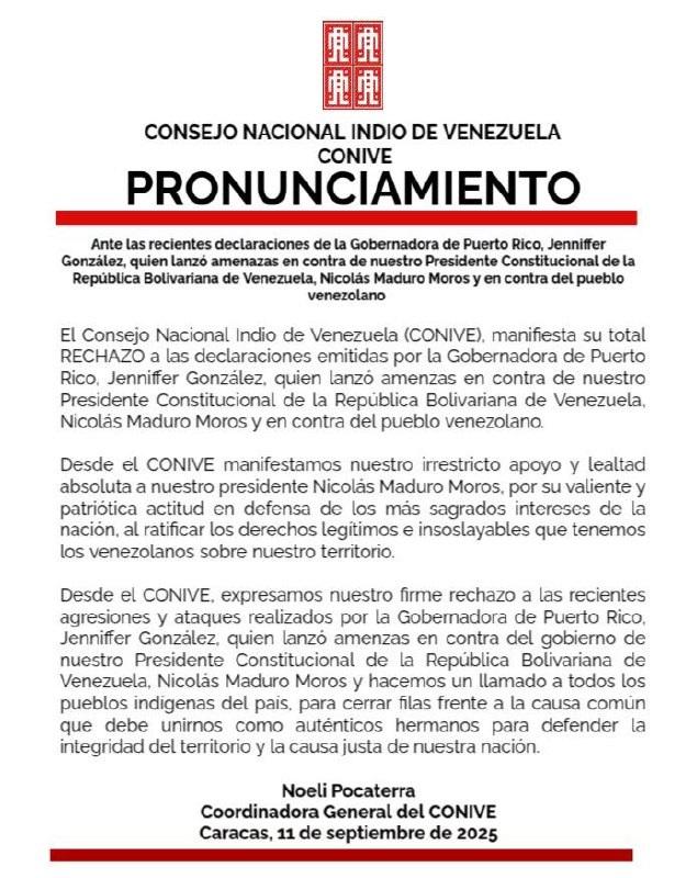 El Consejo Nacional Indio de Venezuela (CONIVE) ha emitido un pronunciamiento oficial, expresando su rotundo rechazo a las recientes declaraciones y amenazas proferidas por la Gobernadora de Puerto Rico, Jenniffer González.