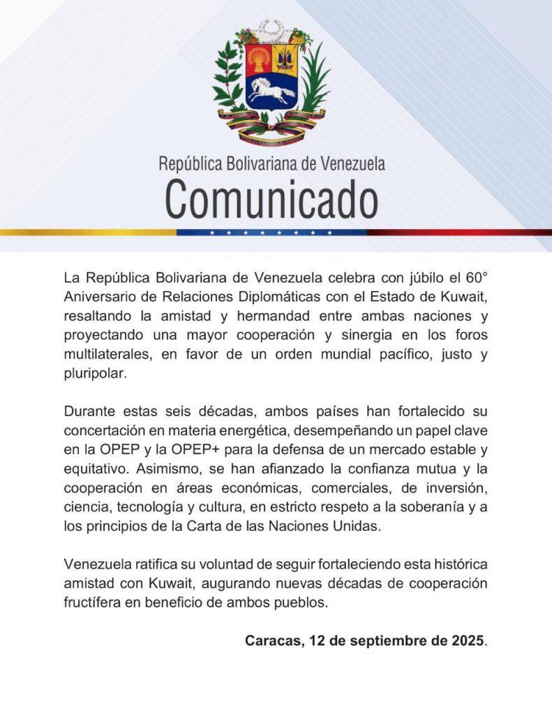 La República Bolivariana de Venezuela celebra con júbilo el 60.° Aniversario del establecimiento de sus Relaciones Diplomáticas con el Estado de Kuwait. Este hito histórico fue destacado mediante un comunicado oficial del canciller venezolano, Yván Gil, que enfatiza la solidez de un vínculo construido sobre la amistad y la hermandad.