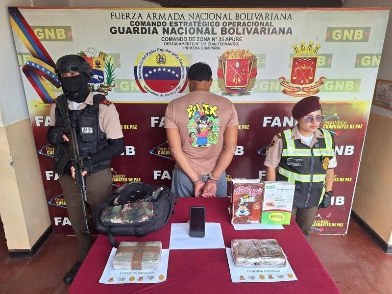 Durante el procedimiento de control, dirigido a vehículos, equipaje y personas, se logró la aprehensión de un ciudadano quien transportaba dos envoltorios de cocaína, con un peso total de 2 kilogramos con 280 gramos, los cuales ocultaba entre sus pertenencias. El individuo se desplazaba en un vehículo de transporte público desde el Municipio Pedro Camejo (San Juan de Payara) con destino a San Fernando de Apure.