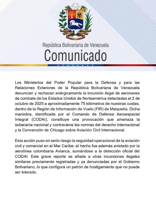 Los Ministerios para la Defensa y Relaciones Exteriores de Venezuela emitieron un comunicado conjunto rechazando enérgicamente la presencia ilegal de aeronaves de combate estadounidenses detectadas a 75 kilómetros de las costas venezolanas. Esta incursión, calificada como una grave amenaza a la soberanía nacional, ocurrió dentro de la Región de Información de Vuelo (FIR) de Maiquetía, espacio bajo jurisdicción venezolana.