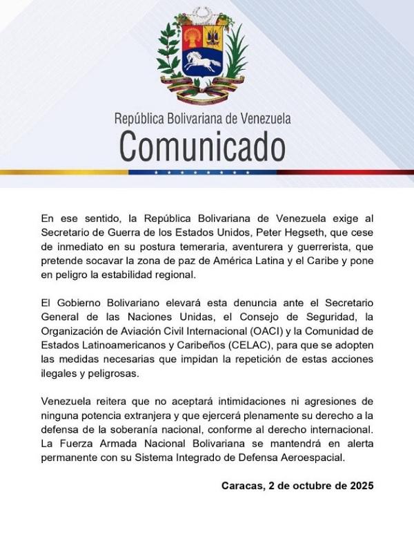 El Gobierno venezolano exige al secretario de Guerra de los Estados Unidos, Peter Hegseth, que abandone inmediatamente su postura temeraria y guerrerista, la cual pretende socavar la zona de paz que América Latina y el Caribe han construido. Esta actitud representa un peligro real para la estabilidad regional y la convivencia pacífica entre naciones.