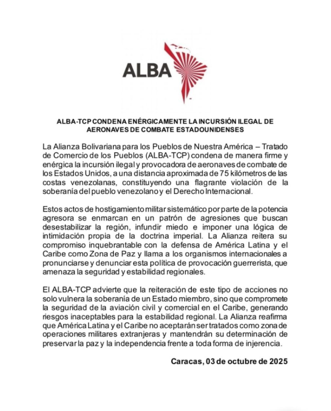 El ALBA-TCP advirtió que estas maniobras de hostigamiento militar vulneran los principios fundamentales de la convivencia pacífica entre Estados y buscan generar tensión y desestabilización en América Latina y el Caribe. El organismo señaló que tales acciones comprometen la seguridad aérea civil y comercial en la región caribeña.