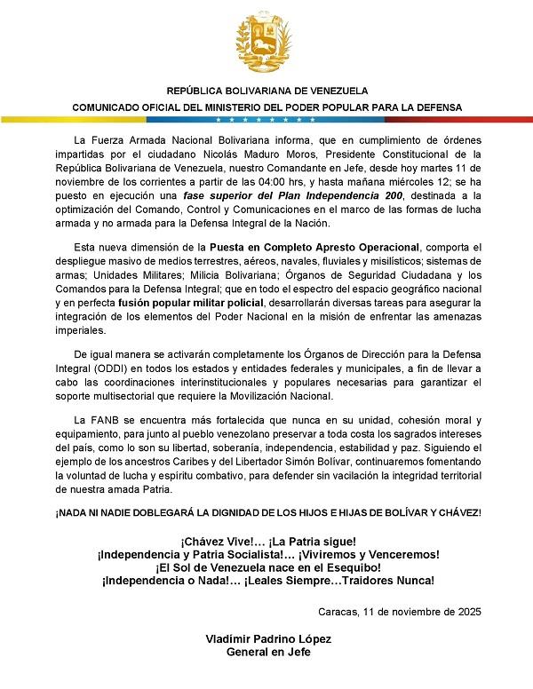 El Ministerio del Poder Popular para la Defensa, a través de un comunicado firmado por el ministro Vladimir Padrino López, informó este martes la puesta en ejecución de la fase superior del Plan Independencia 200, por órdenes del presidente de la República, Nicolás Maduro.