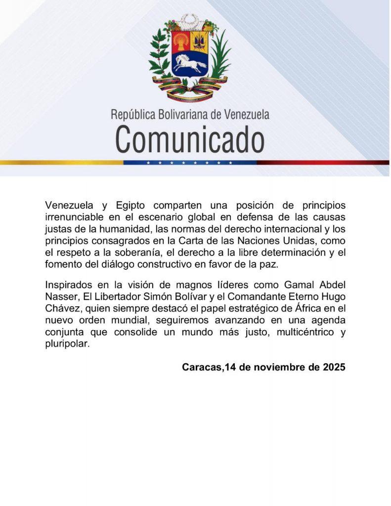 Venezuela y Egipto comparten una posición de principios irrenunciables en el escenario global. Ambos países defienden las causas justas de la humanidad y las normas del derecho internacional establecidas en la Carta de las Naciones Unidas.