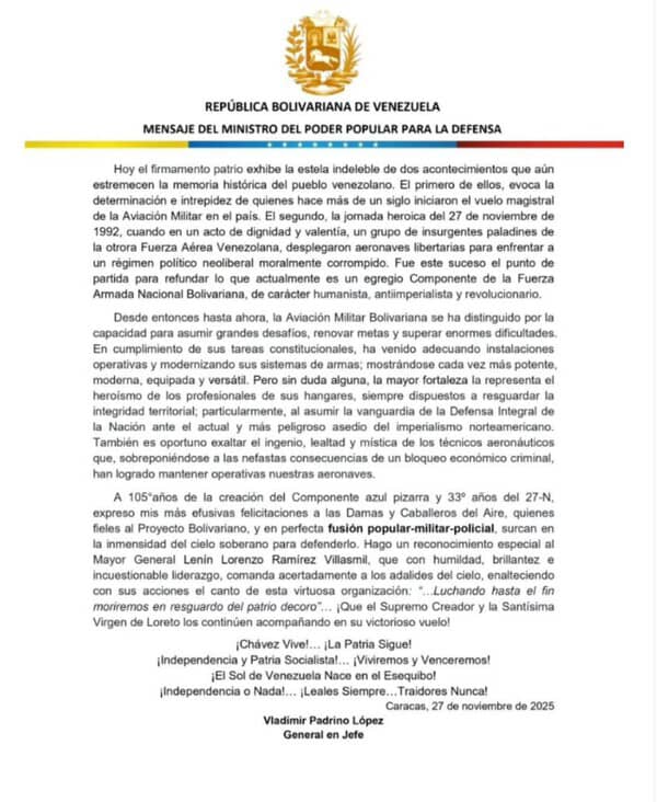 A través de un comunicado oficial del Ministerio del Poder Popular para la Defensa, también subrayó la gesta histórica del 27 de noviembre de 1992 y el 105° aniversario de la institución.