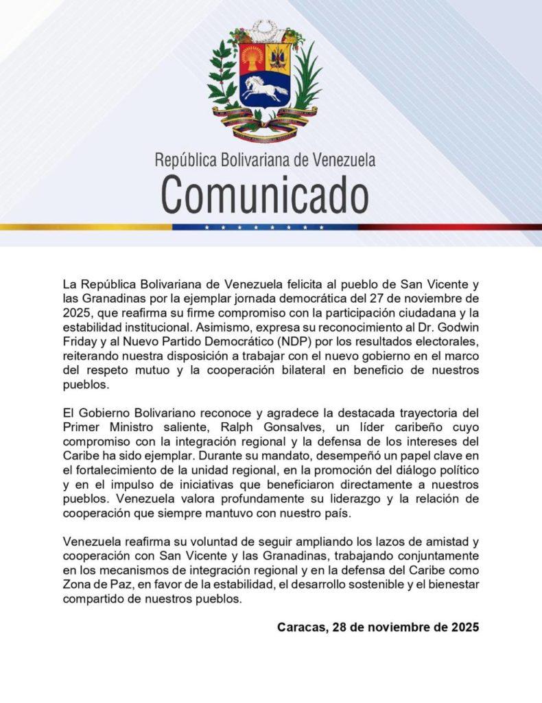 La República Bolivariana de Venezuela expresó su reconocimiento al pueblo de San Vicente y las Granadinas por la ejemplar jornada democrática del 27 de noviembre de 2025.