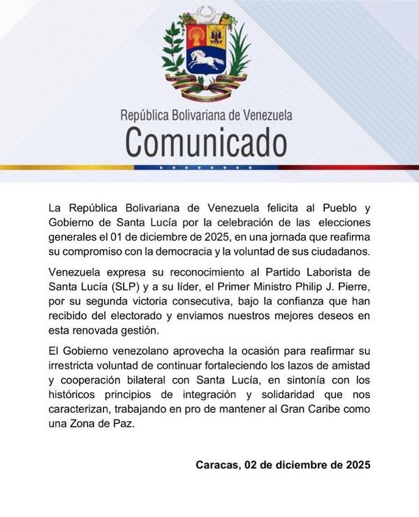 La República Bolivariana de Venezuela, a través de un comunicado oficial suscrito por el Canciller Yván Gil, extiende sus más cálidas felicitaciones al hermano pueblo de Santa Lucía por la culminación exitosa y pacífica de las elecciones generales celebradas el pasado 01 de diciembre.