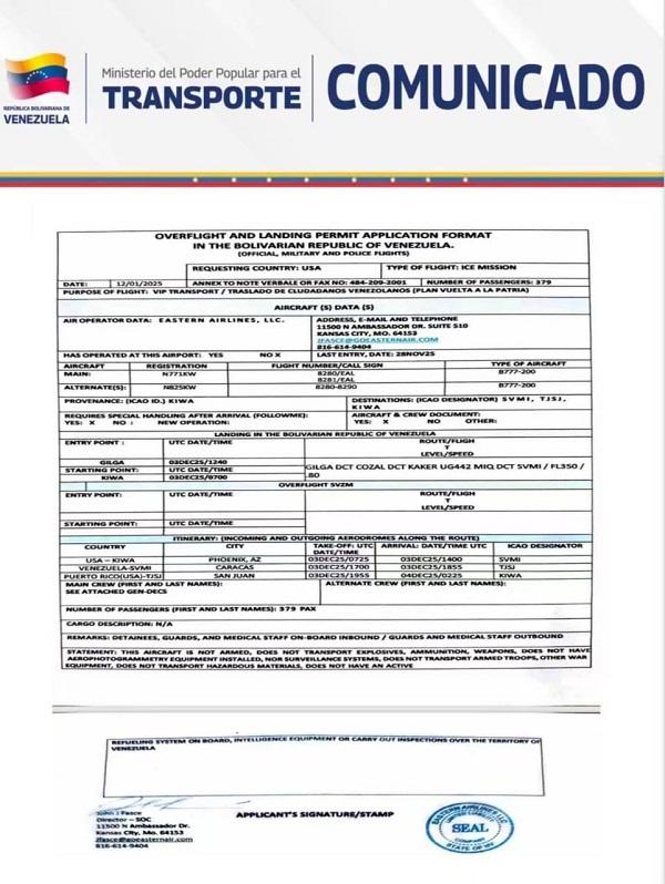 En un comunicado difundido por el Ministerio del Poder Popular para el Transporte, la Autoridad Aeronáutica especificó que las aeronaves con matrícula N771KW (principal) y N825KW (alterna) están autorizadas para ingresar al espacio aéreo venezolano con este fin.