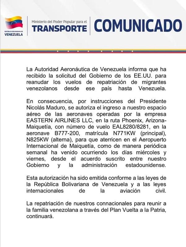 La Autoridad Aeronáutica de Venezuela informó este martes que, tras recibir una solicitud formal del Gobierno de los Estados Unidos (EE. UU.), ha autorizado la reanudación de los vuelos de repatriación de ciudadanos venezolanos desde territorio norteamericano.