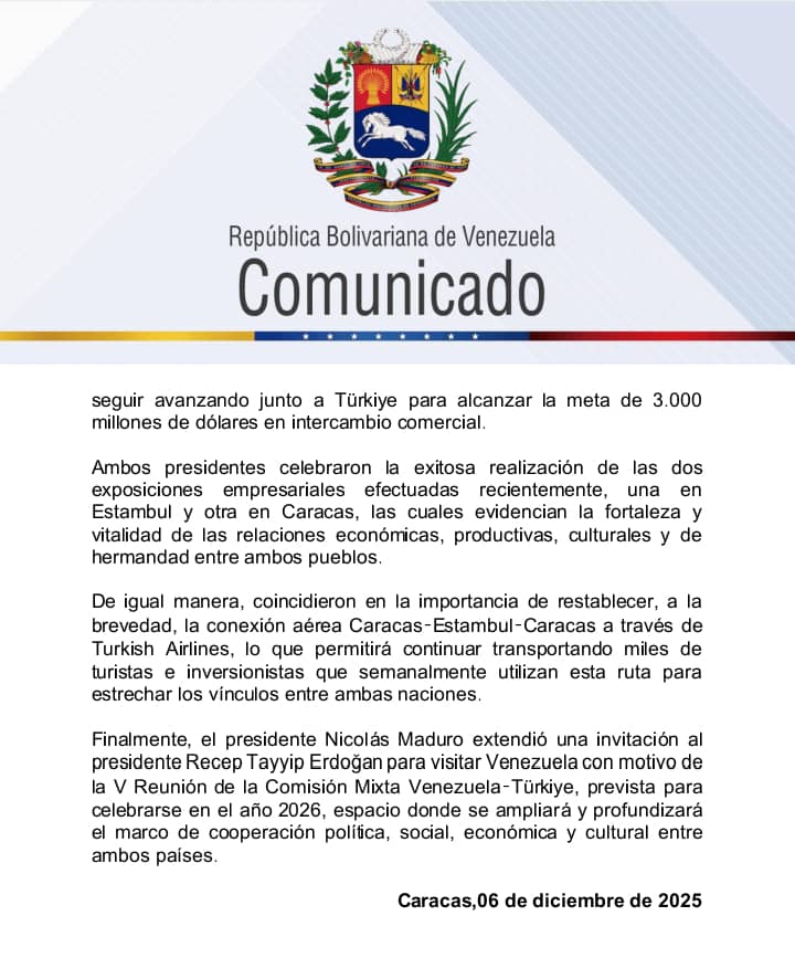 De igual forma, se reafirmó el compromiso de alcanzar la meta de 3.000 millones de dólares en intercambio comercial, un objetivo que refleja la profundización de los vínculos económicos. Como gesto de esta voluntad política, el presidente Maduro extendió una invitación formal al presidente Erdoğan para visitar Venezuela en 2026, con ocasión de la V Reunión de la Comisión Mixta bilateral.