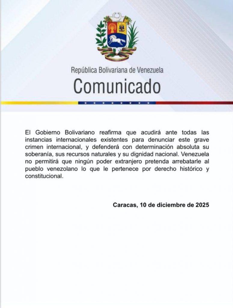 Mediante un comunicado oficial, la Cancillería venezolana repudió enérgicamente lo que calificó como «un robo descarado y un acto de piratería internacional». El documento gubernamental sostiene que dichas acciones forman parte de una política deliberada de despojo de recursos energéticos.