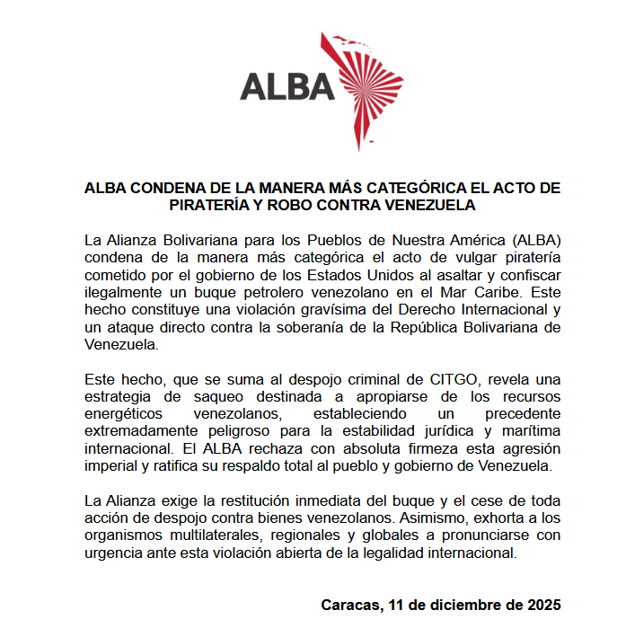La Alianza Bolivariana para los Pueblos de Nuestra América (ALBA) emitió un comunicado oficial donde calificó de «vulgar piratería» el asalto y confiscación de un buque petrolero venezolano por parte del gobierno de los Estados Unidos. El hecho, ocurrido en aguas del mar Caribe, fue condenado de la manera más categórica por el organismo regional.