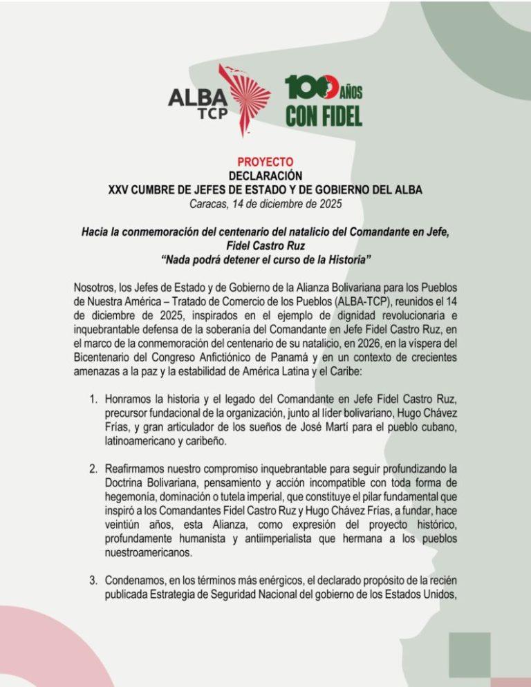 Los jefes de Estado y de Gobierno de la Alianza Bolivariana para los Pueblos de Nuestra América (ALBA-TCP) aprobaron una Declaración Consensuada en su XXV Cumbre. El documento, leído desde Caracas por el presidente venezolano Nicolás Maduro, expresa el más enérgico repudio a la reciente estrategia de seguridad nacional de Estados Unidos.