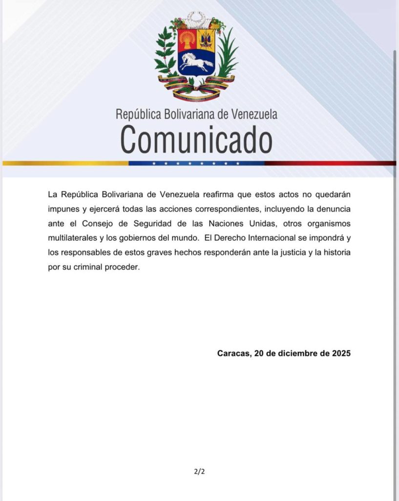 El comunicado, difundido por la Vicepresidenta Ejecutiva y Ministra del Poder Popular para Petróleo, Delcy Rodríguez, especifica con precisión que este hecho constituye un delito de acuerdo con lo informado en el artículo 3 del Convenio para la Represión de Actos Ilícitos contra la Seguridad de la Navegación Marítima. Asimismo, el texto oficial califica el incidente como una violación del artículo 2 de la Carta de las Naciones Unidas, de la Convención de Ginebra sobre la Alta Mar y de los principios de derecho internacional relativos a las relaciones de amistad entre Estados.