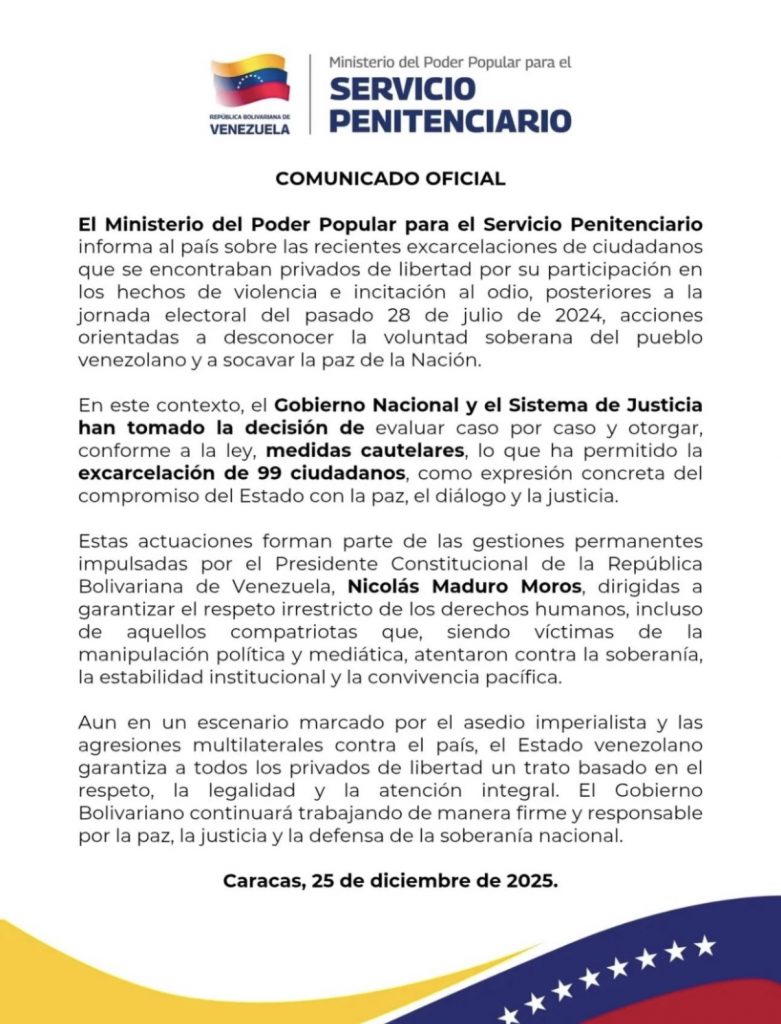 El Ministerio del Poder Popular para el Servicio Penitenciario informó al país a través de un comunicado sobre las recientes excarcelaciones de ciudadanos que se encontraban privados de libertad por su participación en los hechos de violencia e incitación al odio, posteriores a la jornada electoral del pasado 28 de julio de 2024, acciones orientadas a desconocer la voluntad soberana del pueblo venezolano y a socavar la paz de la Nación.